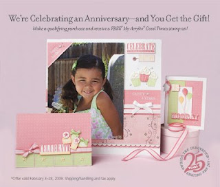 Close To My Heart is celebrating an anniversary in 2009 — but you get the gifts! That’s right — our founder and CEO Jeanette Lynton marks 25 years as a leader and innovator in the stamping business, and to celebrate, they're giving all stamp purchasers a fabulous gift! When you spend $25 US in My Acrylix® stamps (K-size customized, Stamp of the Month, and any discounted retired sets excluded), you’ll receive a totally cool, custom-designed B-size stamp set, appropriately titled “Good Times.” It’s a celebration-themed set, with a variety of fun party icons and sentiments like “let’s party” and “hip hip hooray” that are oh, so versatile. This is a must have set!!!! Available only thru the end of the month :)